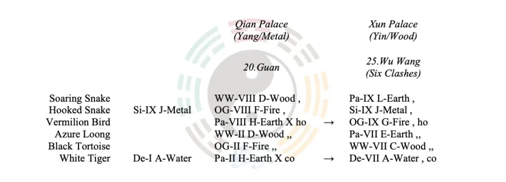 Judgment: When asking about tickets, documents, and similar credentials, the parents line is taken as the significator line. The parents line shows Dual Appearance[1] in the hexagram. Both the host line and the corresponding line are parents H earth, and both are active, so priority is given to the host line as the significator line. The significator line, H earth, receives peer support from the monthly branch E and is prosperous and supportive. Moreover, it is itself active and transforms into the officials and ghosts line, G fire. This forms a return generation, since G fire generates H earth. Its overall strength is very strong. Therefore, this indicates that the ticket could be secured.